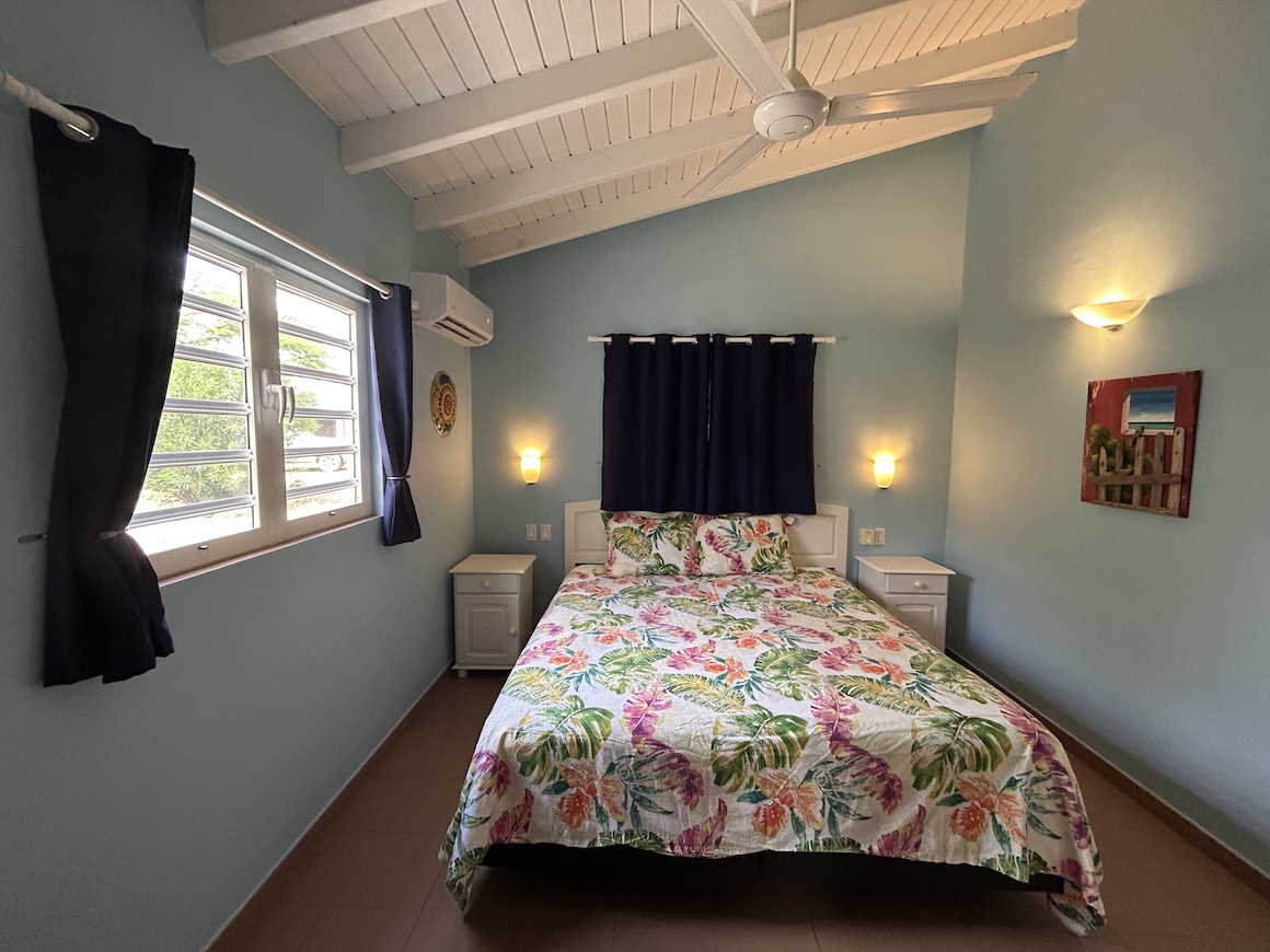 De aparte ruime slaapkamer met eigen badkamer heeft airco en een plafondventilator.